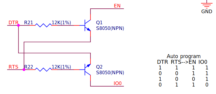 This is similar to the behavior of the cross-coupled logic, with one wrinkle. To go into download mode with this scheme, you have to first set RTS/DTR to false/true to set the download flag, then switch to true/false to reset the ESP32 into download mode. That is exactly opposite from the situation with an external USB Serial chip, where you have to first issue the EN reset with RTS/DTR true/false then quickly switch to false/true to drive the IO0 line low before the EN line goes high after the RC delay.