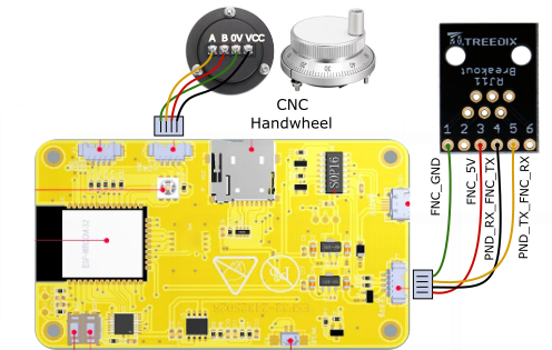 This is the basic wiring for the capacitive CYD, with handwheel, without physical buttons. To upload new firmware with this wiring, you must unplug the FluidNC serial connection and plug in the USB port.
