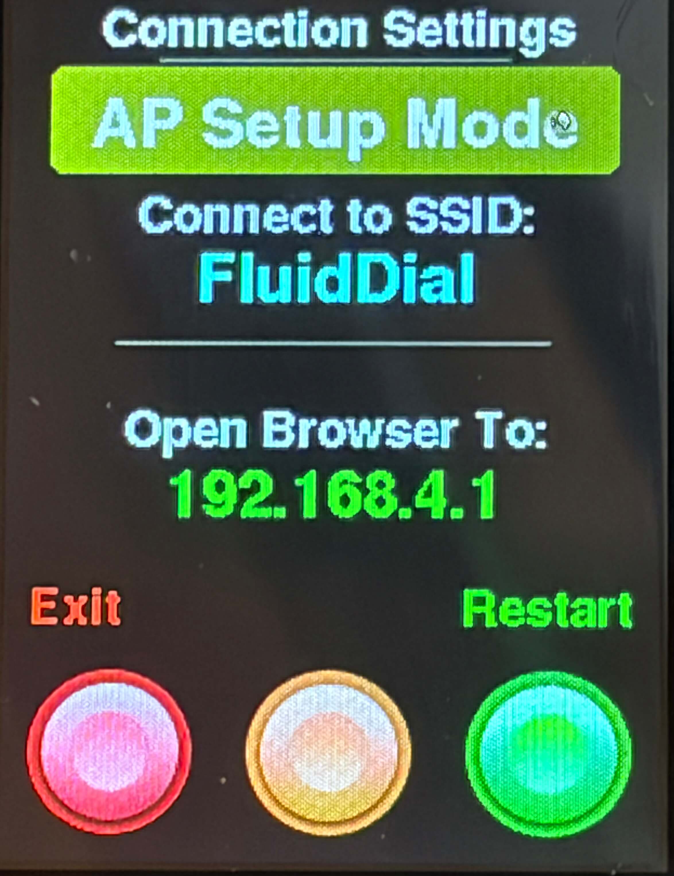 - If WiFi is selected, the pendant enters AP mode — connect to the "FluidDial" network from your phone or computer