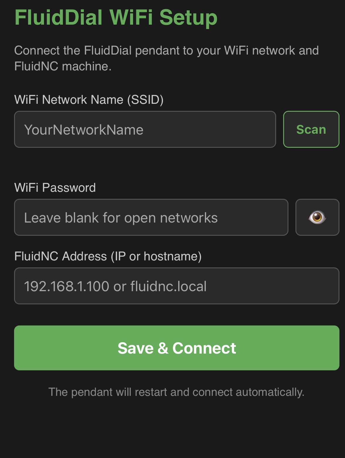- Enter your WiFi password and the FluidNC hostname or IP address