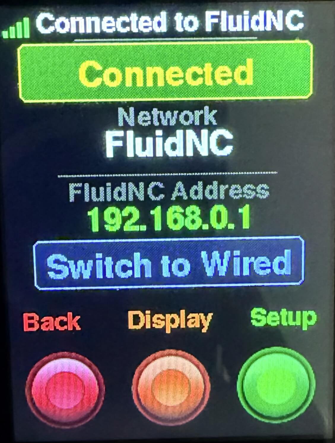 - Displays the current connection mode and connected network name and FluidNC address when in WiFi mode