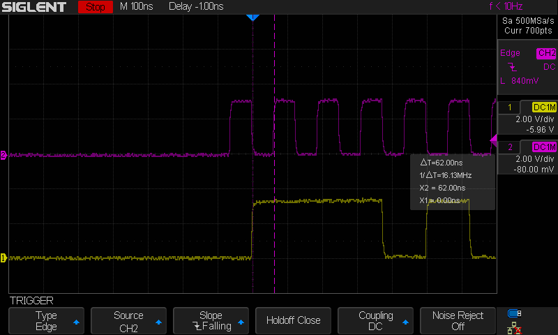 I used a Siglent SDSD1102X dual-channel oscilloscope to observe various signals at different places. The scope has 100 MHz bandwidth at 1 GSa/s sample rate. The probes are rated at 100 MHz - but higher speed details can be observed with reduced amplitude.